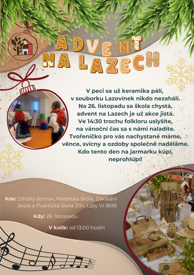 V peci sa už keramika pálí, v souborku Lazovínek nikdo nezahálí. Na 26. listopadu sa škola chystá, advent na Lazech je už akce jistá. Ve 14:30 trochu folkloru uslyšíte, na vánoční čas sa s námi naladíte. Tvořeníčko pro vás nachystané máme, věnce, svícny a ozdoby společně naděláme. Kdo tento den na jarmarku kúpí, neprohlúpí!
