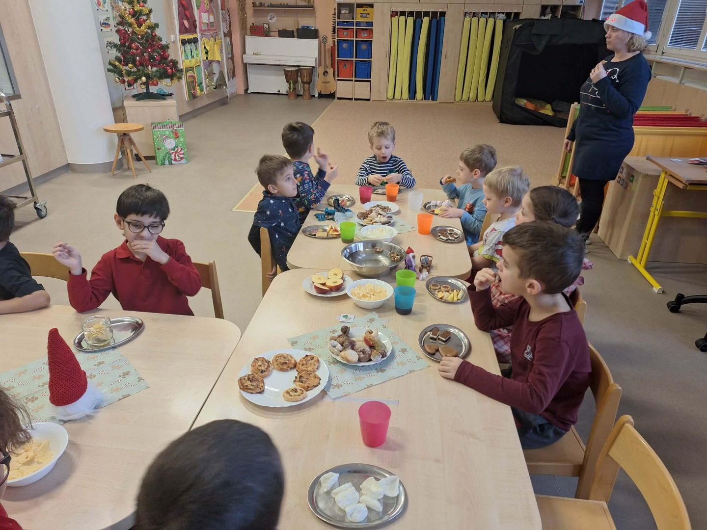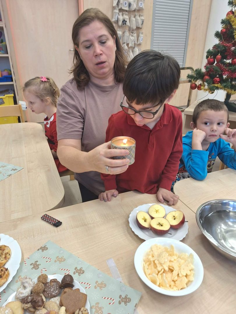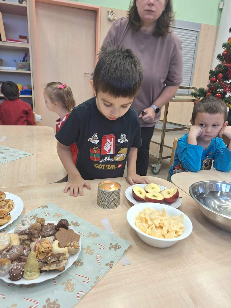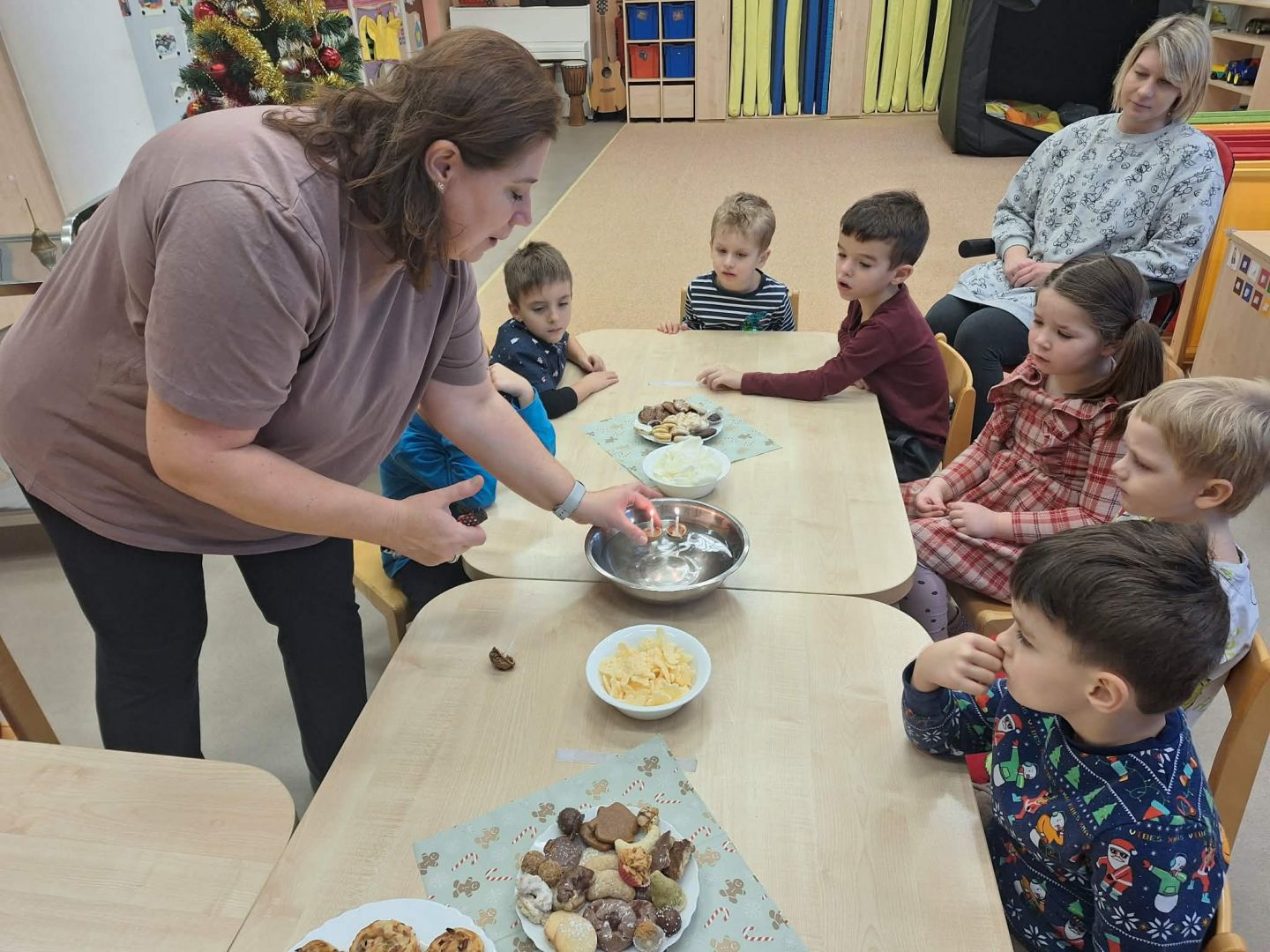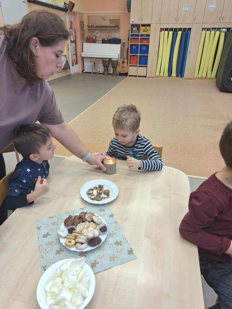 Dnes jsme si v MŠ uspořádali slavnostní dopoledne "Posezení u vánočního stromečku" - zážitkovou pedagogiku. Společně jsme si zavzpomínali, jak Vánoce slavili naši dědečkové a babičky. Děti si vyzkoušely některé tradice, zpívali jsme koledy, ochutnávali vánoční cukroví a nakonec nám Ježíšek nadělil dárečky :)